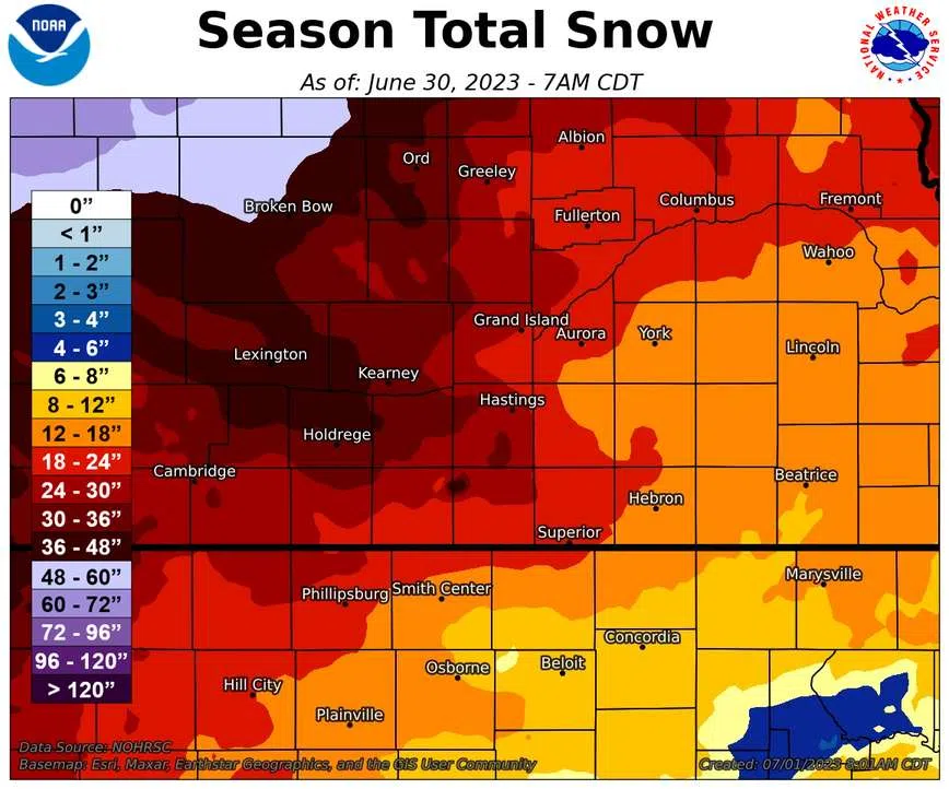 • The highest 2022-23 seasonal snow totals were 36.0 inches in Holdrege, Phelps County and 35.5 inches in Ord, Valley County.
