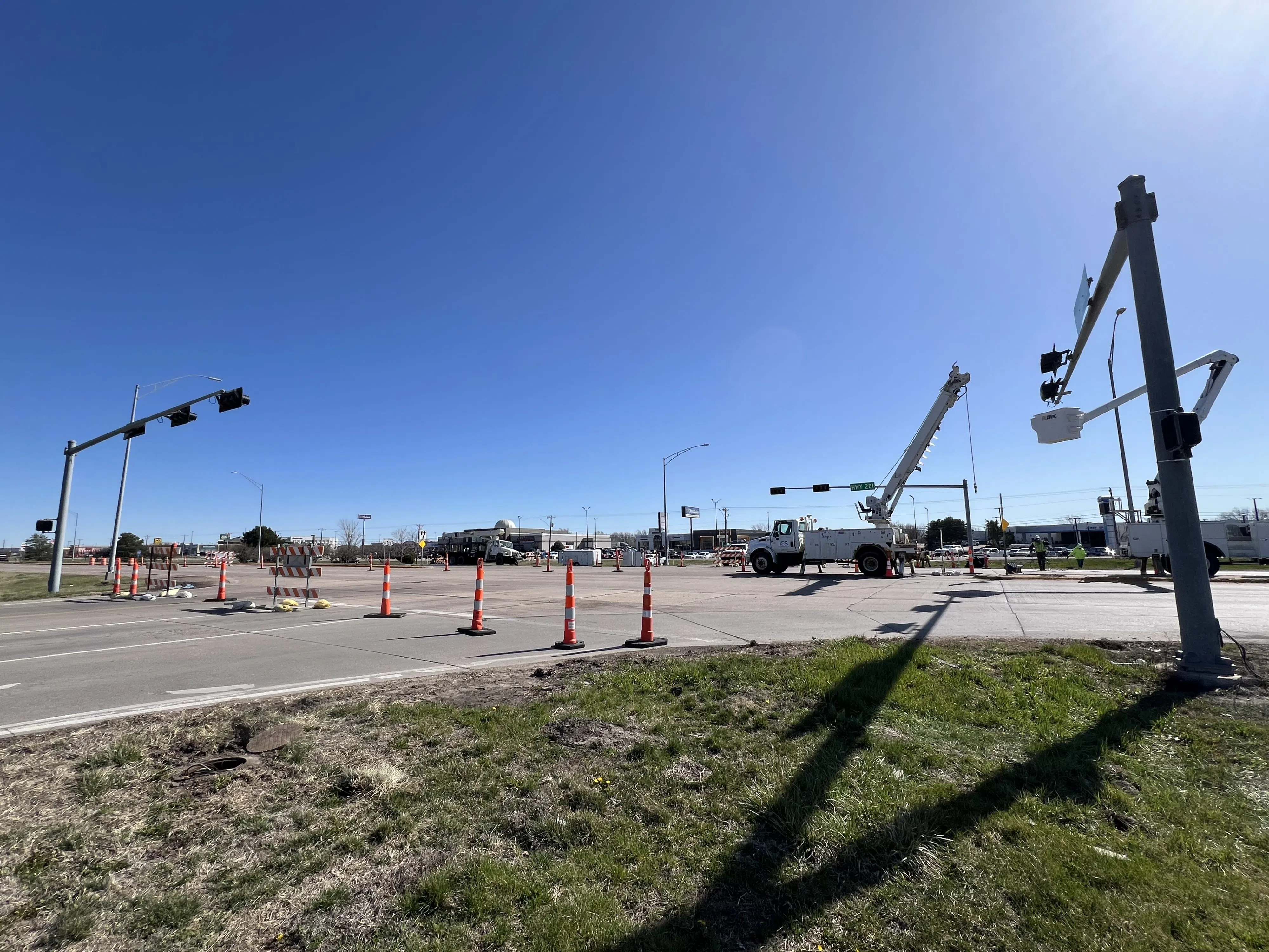 The new traffic signal pole will accommodate a longer mast arm with a signal head for northbound left turning traffic. When the intersection traffic signal upgrade is completed, motorists on U.S. Highway 34/281 at North Shore Drive will have flashing yellow left turn arrows. The project is also replacing all of the signal cable, installing a new controller, and adding antennas for interconnect.