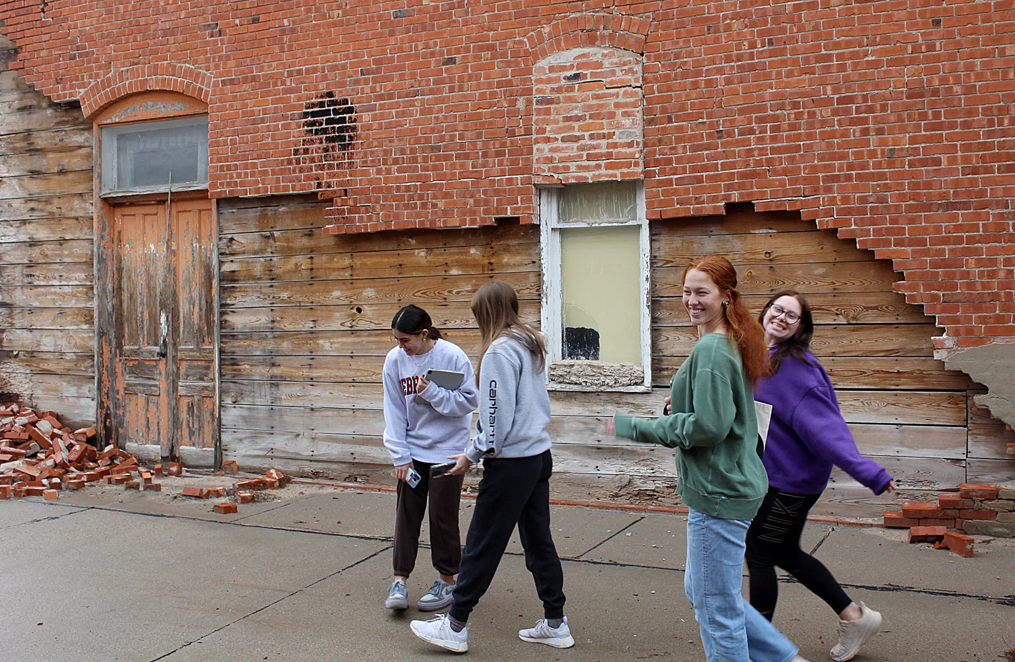 Students in the UNK interior and product design program visit the Marcellus Building in downtown Franklin earlier this year. They’re working with community officials and the South Central Economic Development District on a project that would turn the historic property into affordable housing. (Courtesy photo)