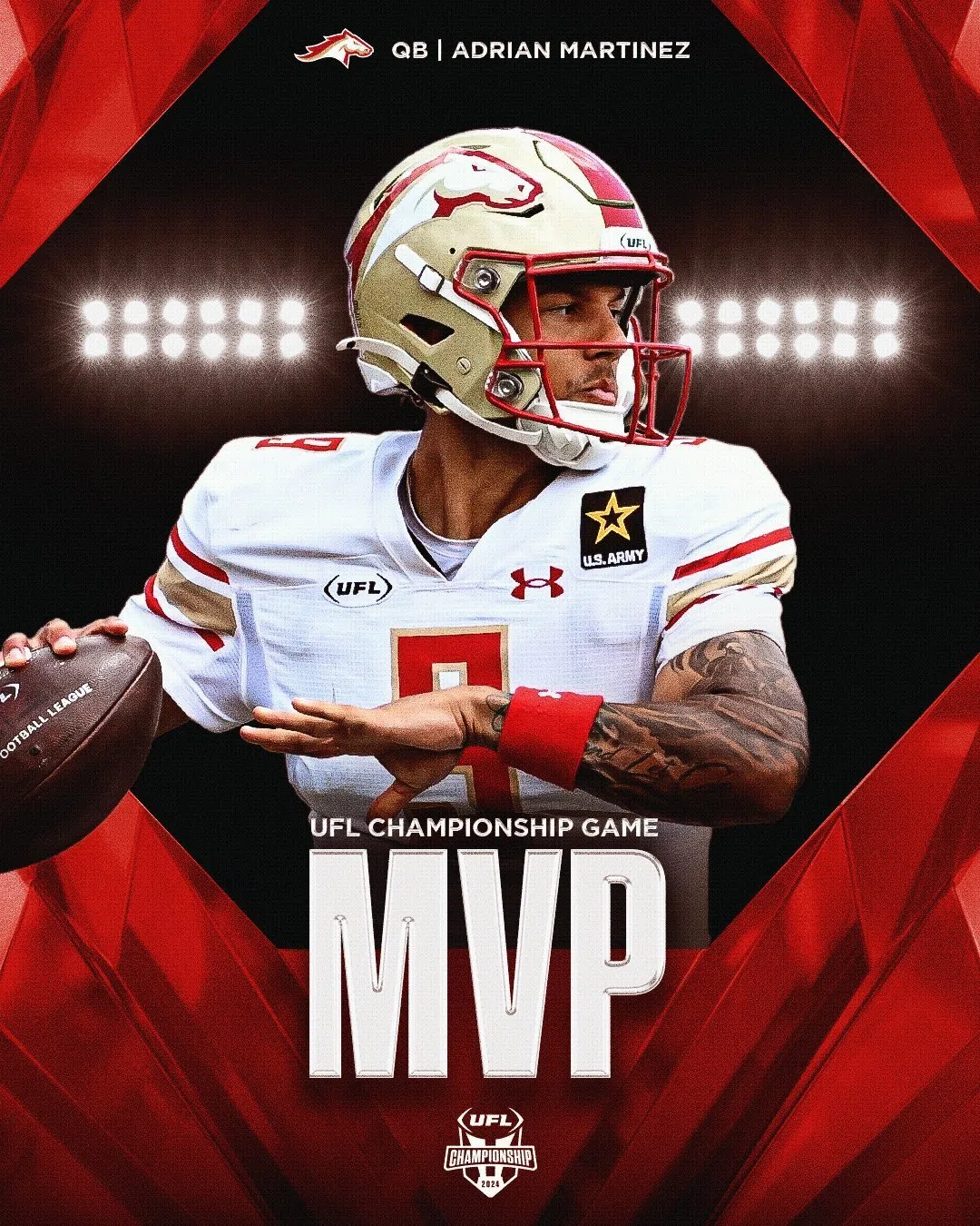 Martinez, the UFL MVP, was also named the UFL Championship MVP. Martinez went 13-for-23 passing for 98 yards and a touchdown and added 54 rushing yards with two rushing touchdowns. NFL legend Tom Brady presented Martinez with the Championship MVP trophy after the game.
