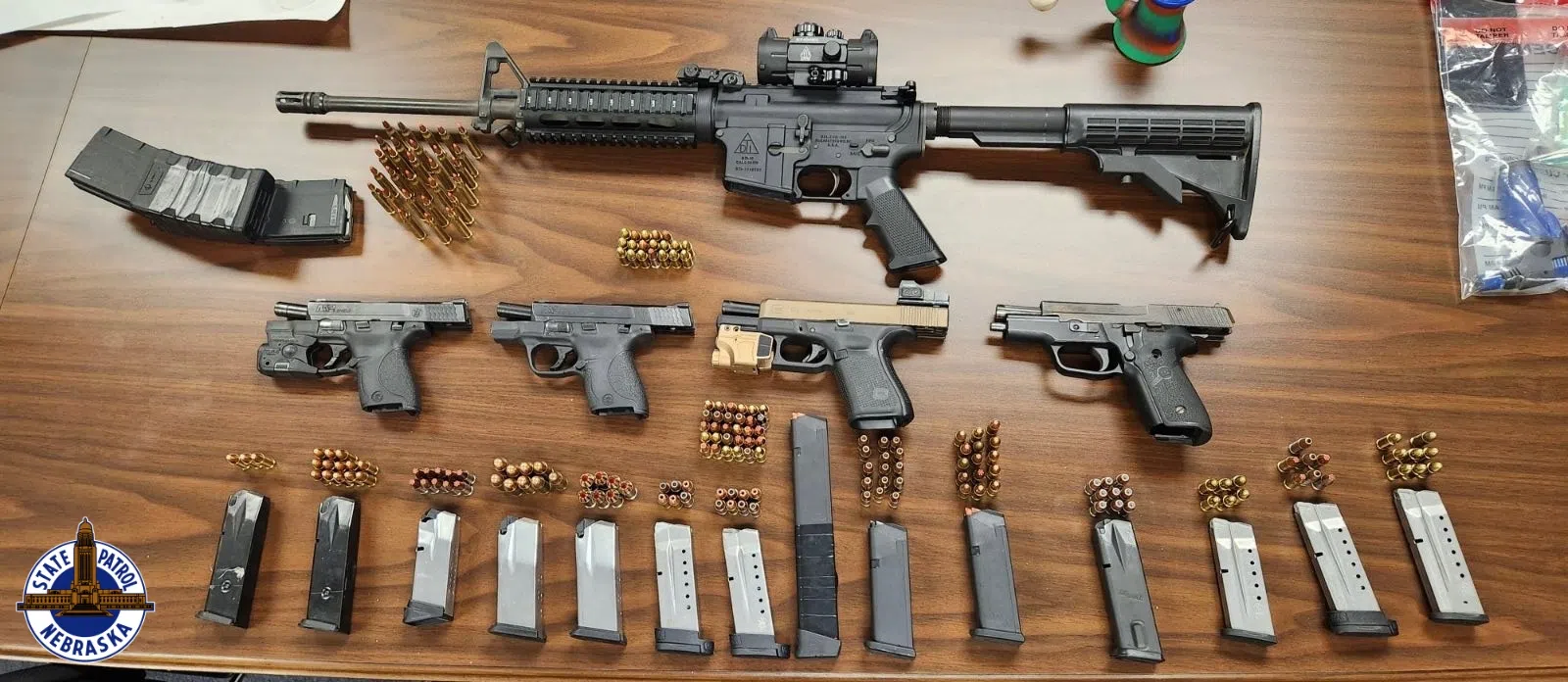 . Troopers located stolen firearms, stolen credits cards, and methamphetamine inside the first stolen vehicle, (Nebraska State Patrol, Courtesy)