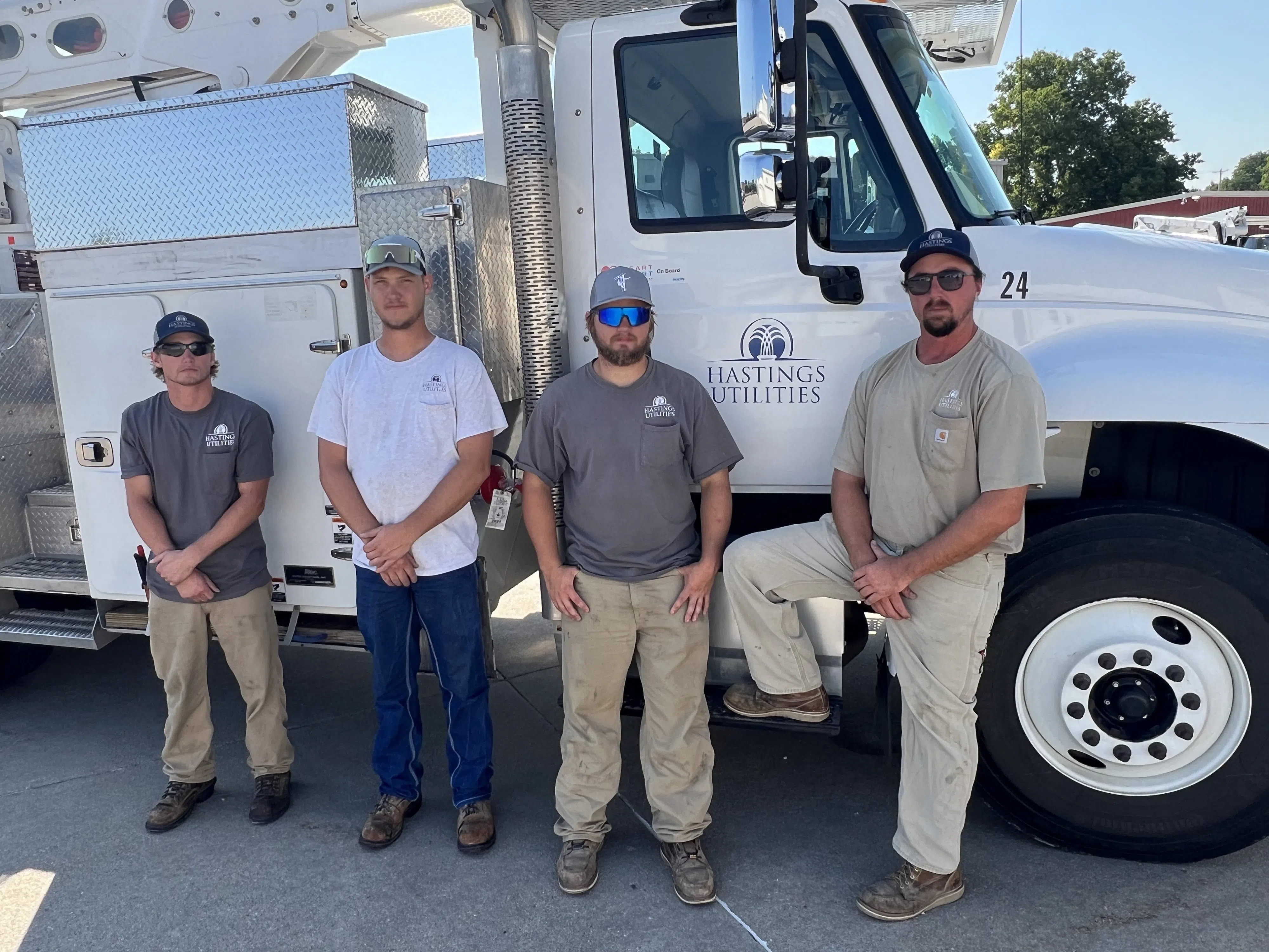 HASTINGS — Hastings Utilities electric distribution crew members Journeymen Linemen Zach Beckenhauer and Ryan Hoover; and Apprentice Linemen Talyn Campbell and Triston Abraham left on the morning of Thursday, Aug. 1.