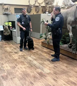 Police Officer Tyler Noel is the handler for comfort dog Boone, who is an English lab. Police Officer Bourke Bowen is the handler for service dog Cello, who is a Dutch shepherd. Cello joins the K9 unit at the Police Department. Each dog is just a little over 1 year old.