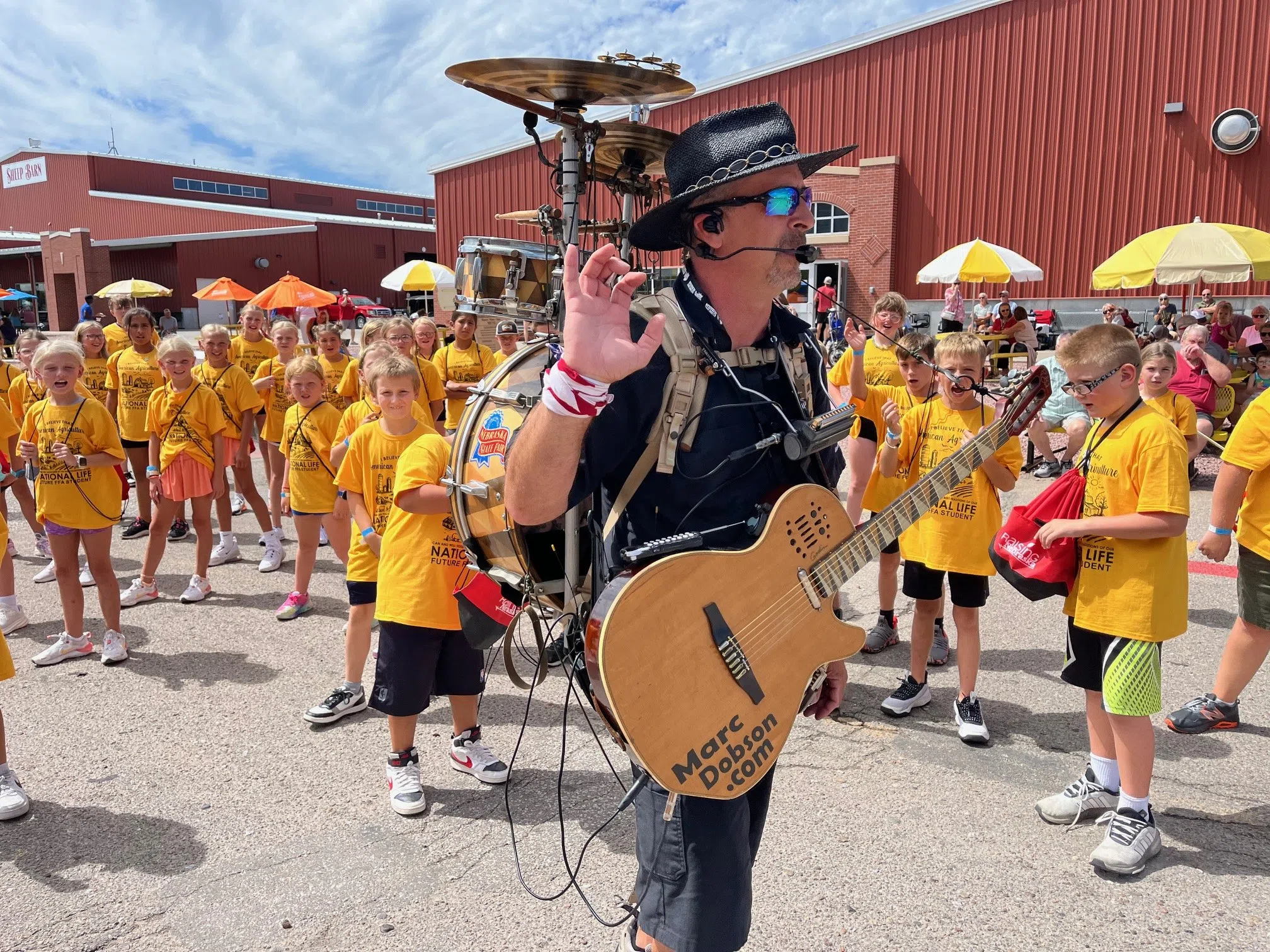 Marc Dobson performs as the One Man Band as a group of students dance to his music, (Carol Bryant, Central Nebraska Today)