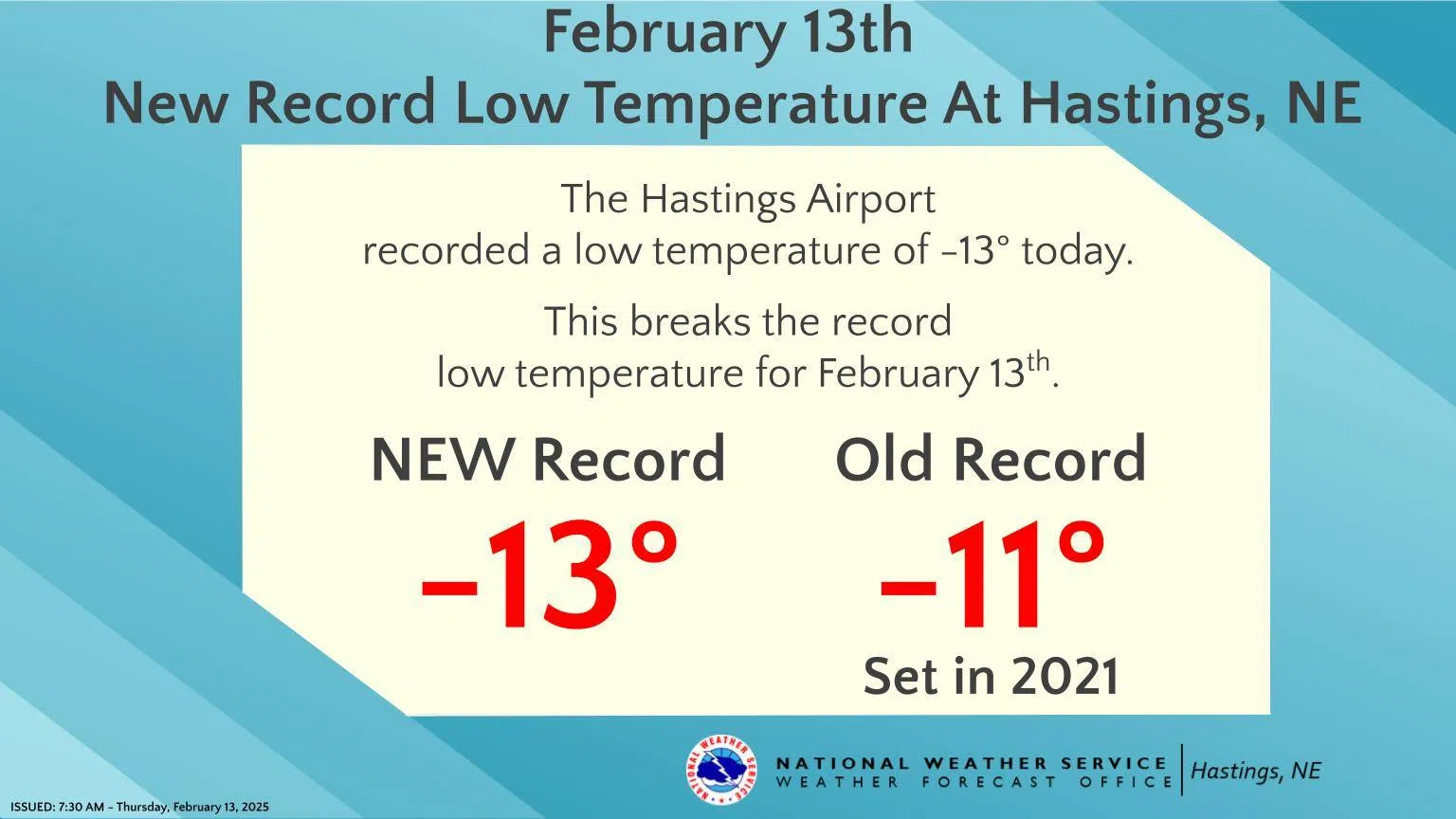 According to the National Weather Service – Hastings, the Hastings Airport recorded a low temperature of -13 degrees on Feb. 13, which broke the previous record, -11, set on this date back in 2021.