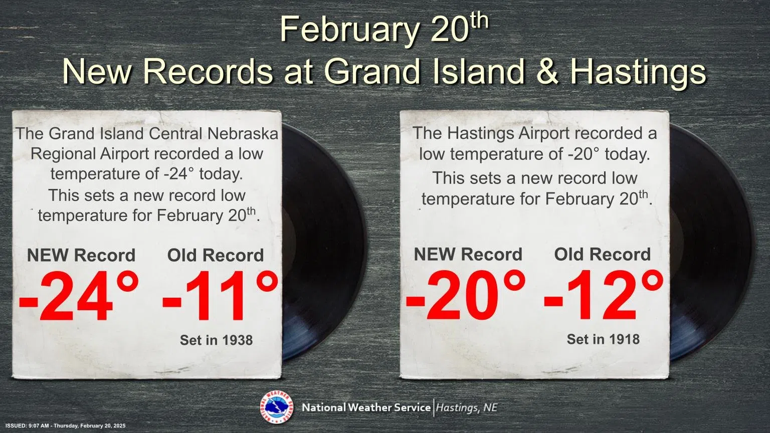 New record low temperatures set for Feb. 20 in Grand Island, Hastings, (NWS Hastings, Courtesy)