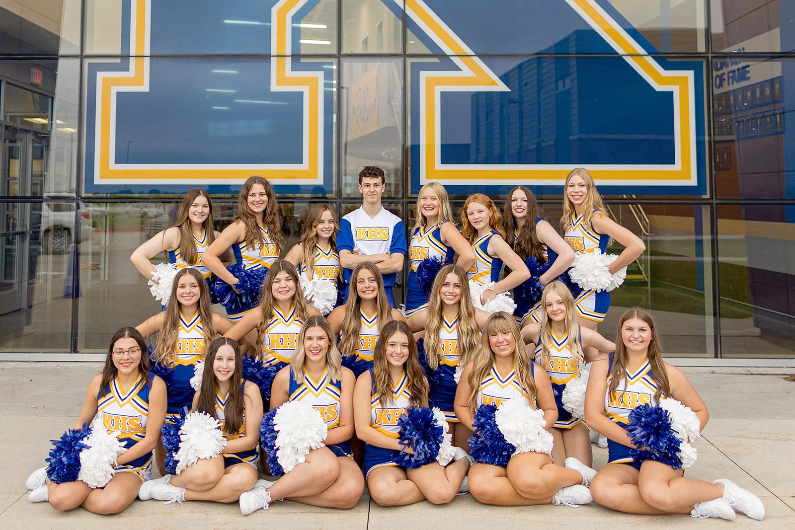 KHS Cheer Team: Seniors: Calla Ripp, Emily Larsen, Grace Schuster, Sara Hempstead, Tatum Kidd, Ty Royal, Adriana Valdovinos Juniors: Aubree Sheetz, Kaitlyn Rehtus, Lexi Hess, Makenna Bose, Shayne Brown Sophomores: Torrie Tracy, Kennady Krause, Faith Sedlacek Freshmen: McKenna Brecht, Josie Mast, Faith Schuster, Cathryn Karjalainen Coaches: Ashley Bush, Tammy Rehtus.