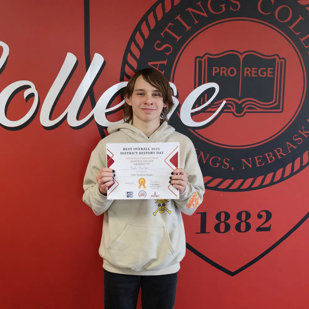Tied for third place was Noah Bardon of Hastings High School with a senior individual paper on “The Rights & Responsibilities of the Rich: Andrew Carnegie’s “Gospel of Wealth,”” and senior group exhibit Athena Barney, Caylen Donner and Natalie Warner of Hastings High School with “Rights of the Insane: Asylum Reforms of the 19th Century”. All will receive a $4,000 scholarship to Hastings College.