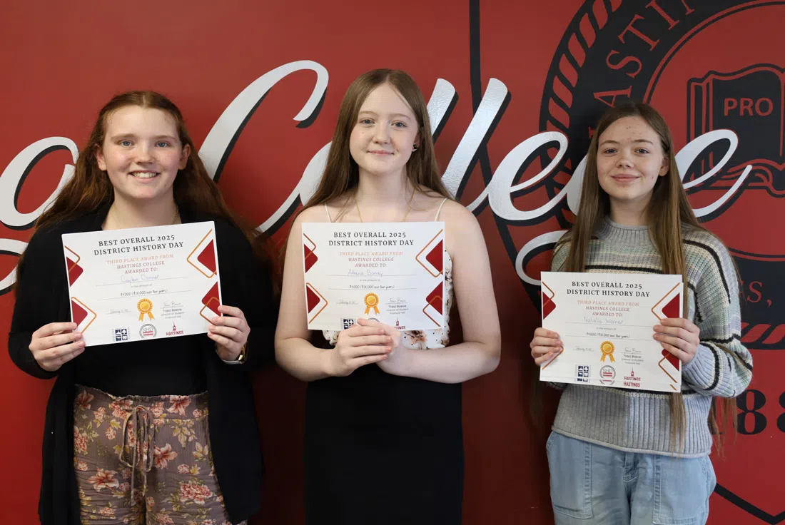 Tied for third place was Noah Bardon of Hastings High School with a senior individual paper on “The Rights & Responsibilities of the Rich: Andrew Carnegie’s “Gospel of Wealth,”” and senior group exhibit Athena Barney, Caylen Donner and Natalie Warner of Hastings High School with “Rights of the Insane: Asylum Reforms of the 19th Century”. All will receive a $4,000 scholarship to Hastings College.