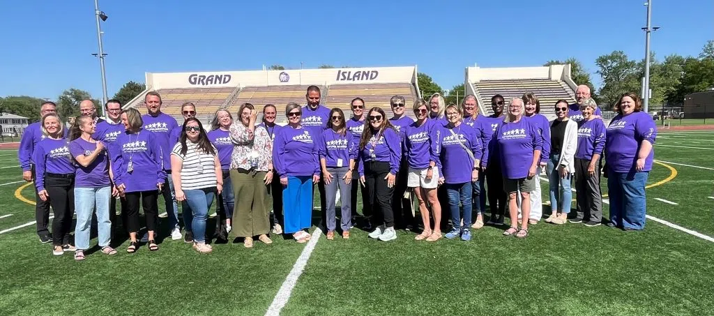 Grand Island Public Schools staff and other people associated with the school district’s foundation staff campaign stand on Jack Martin Field inside Memorial Stadium on May 12 at the conclusion of the meeting to announce results of the Grand Island Public Schools staff giving campaign, (Carol Bryant, Central Nebraska Today)