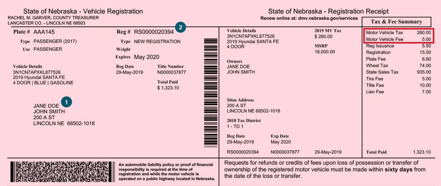 Disabled veterans in Nebraska can soon have the Motor Vehicle Tax and Motor Vehicle Fee (outlined in red in the example) exempted from their vehicle registration for one vehicle, (Courtesy)