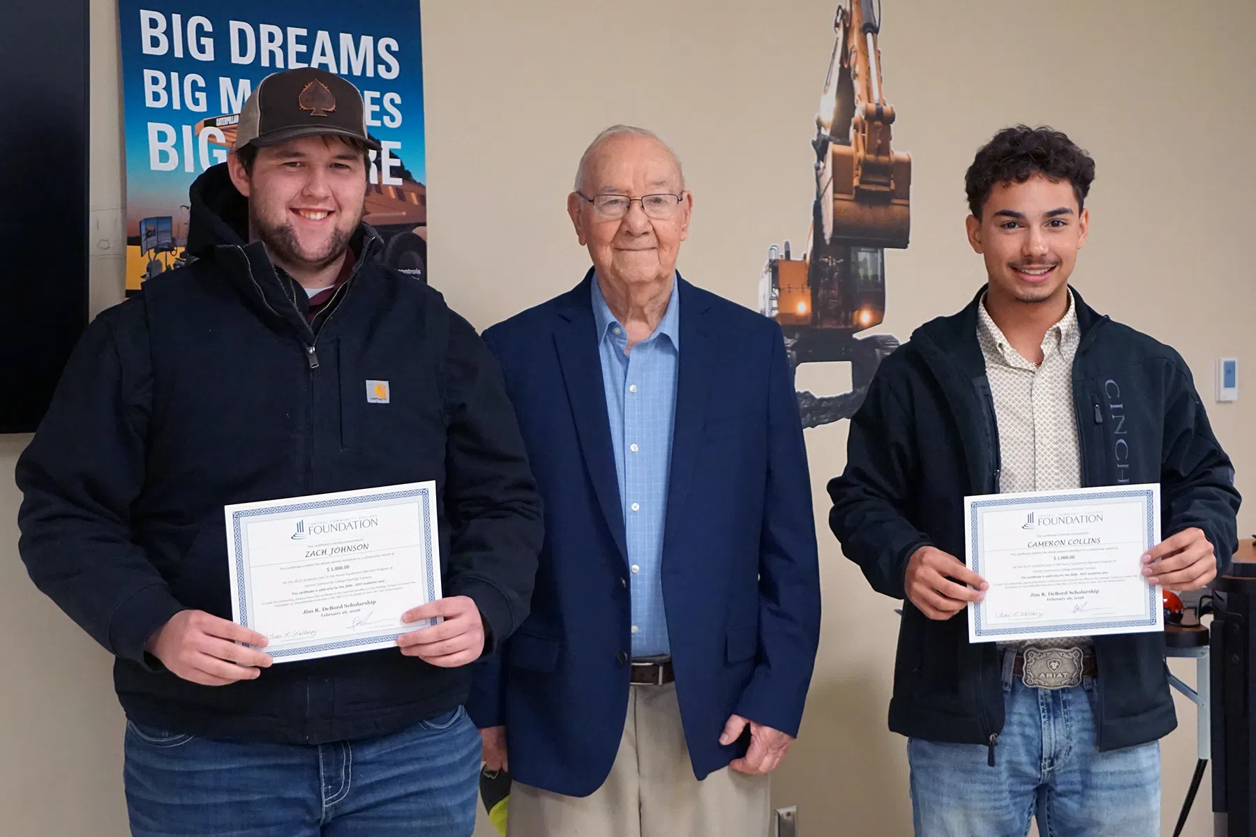 The DeBord Scholarship was established in 2020 by Ron Debord, Jim’s son, and his wife, Tammy. Each year, $1,000 scholarships are presented to two students in the heavy equipment operator technician (HEOT) program at the Hastings Campus. This year, Cameron Collins of Lincoln and Zach Johnson of Grand Island were named as the recipients.