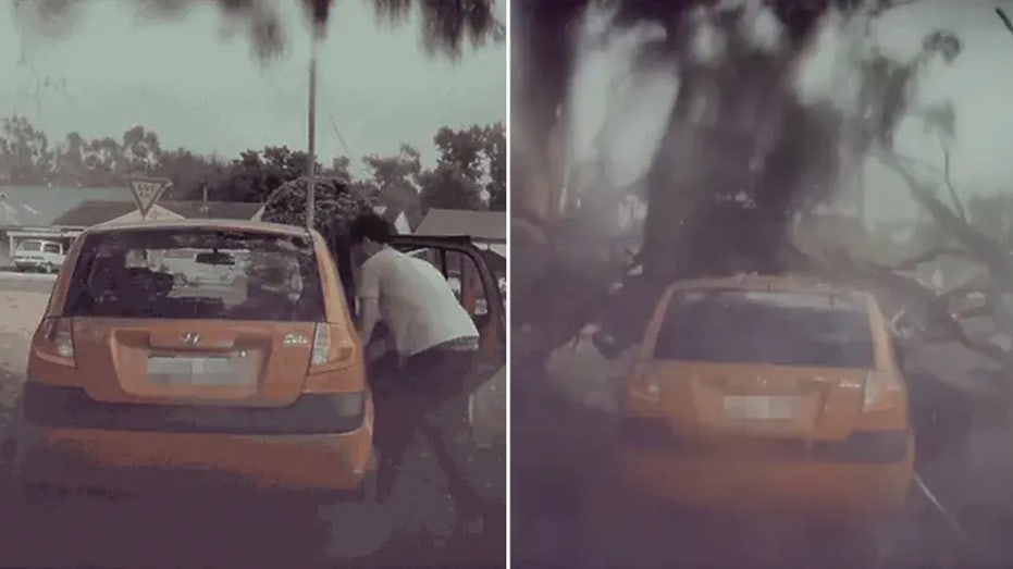 WATCH: Tree hit by lightning strike shatters into man's car, narrowly missing driver