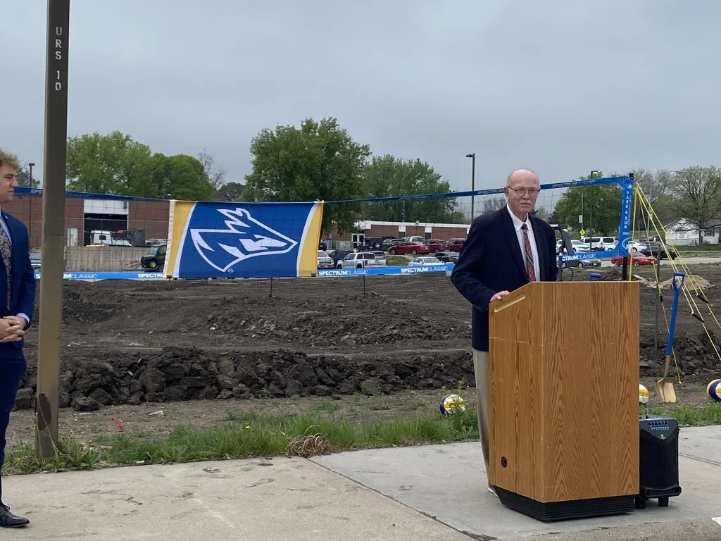 UNK Interim Chancellor Charlie Bicak speaks at the groundbreaking for the new sand volleyball courts on UNK's campus (Alex Hammeke, CentralNebraskaTODAY.com)
