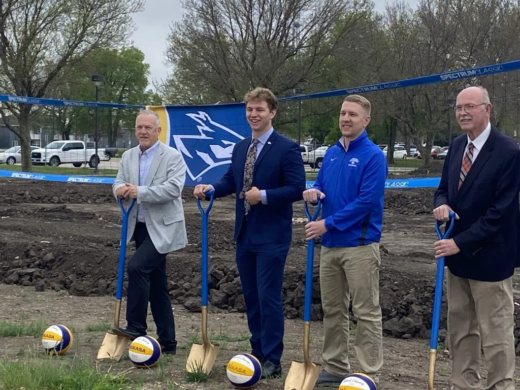 Bill Murphy of UNK Athletics, UNK Student Regent Sam Schroeder, Andrew Winscot of UNK Campus Rec, and UNK Interim Chancellor Charli Bicak get ready for the groundbreaking of UNK's new sand volleyball courts. (Alex Hammeke, CentralNebraskaTODAY.com)